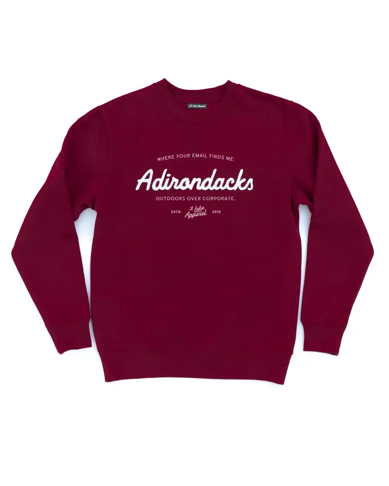 Unisex Adirondack crewneck sweatshirt made of organic cotton + recycled polyester. The design combines sewn felt lettering with printed text reading: “Where your email finds me: Adirondacks. Outdoors over corporate.