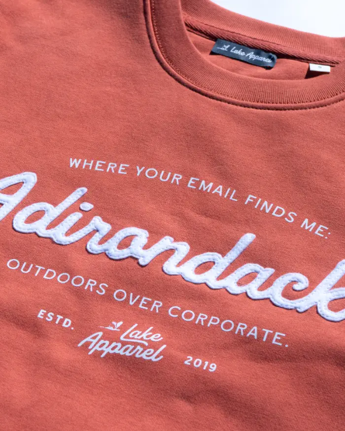 Our Adirondack Organic Crewneck Sweatshirt blends both nature and narrative. Made with 80% organic cotton and 20% recycled polyester, this unisex crewneck delivers durable softness and eco-minded comfort. The design combines sewn felt lettering with printed text reading: “Where your email finds me: Adirondacks. Outdoors over corporate.” The contrast offers a tactile, eye-catching statement for mountain lovers.