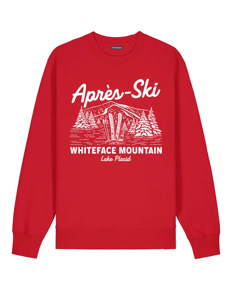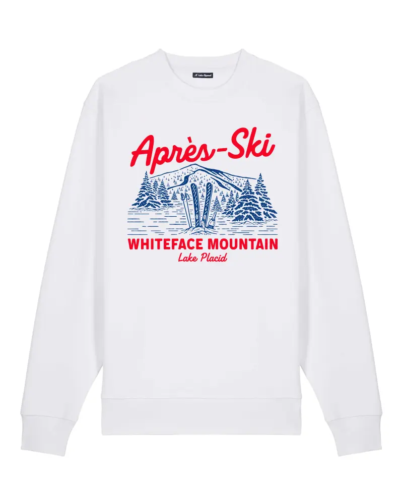 Celebrate après ski life with our Lake Placid crewneck featuring Whiteface Mountain skis and champagne graphics. Organic cotton blend, unisex fit.